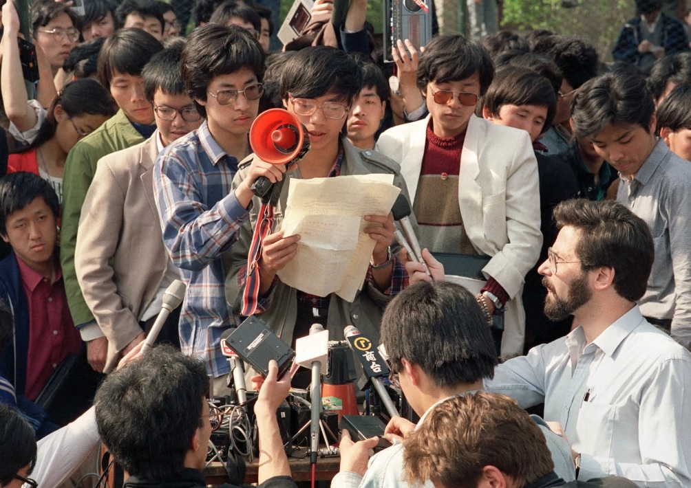 天安門広場に集まった人々に呼びかける民主化運動の学生リーダー (左から柴玲、ウアルカイシ、王丹) (C)AFP・時事